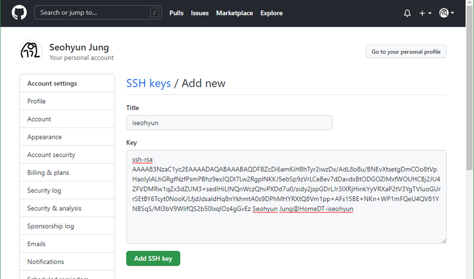 - 왼쪽메뉴에서... SSH and GPG keys > New SSH key