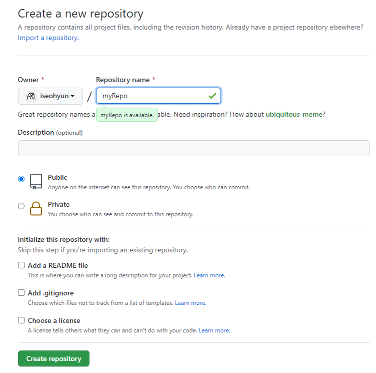 - 이름을 정함(myRepo) > 만들기 (Create repository)
